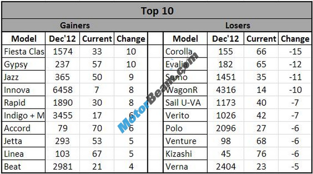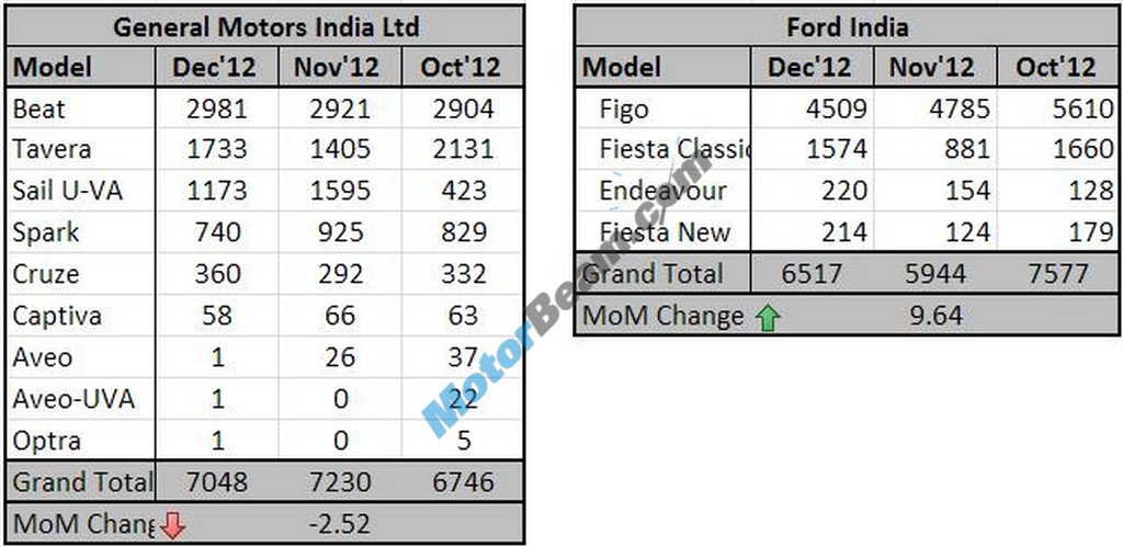 How style and price of a car are crucial in India, can be seen in General Motor’s sales chart below. Even though Spark and Sail U-VA are their latest offerings in their portfolio, the sales of both cars dropped and are falling even behind the Beat and Tavera. Overall, sales figures of Chevrolet dropped by 2.52% in December. For Ford India, the year 2012 was an under performing year as compared to 2011. But anyhow they managed to end it on some good note as their sales figures recorded rise of 9.64%.