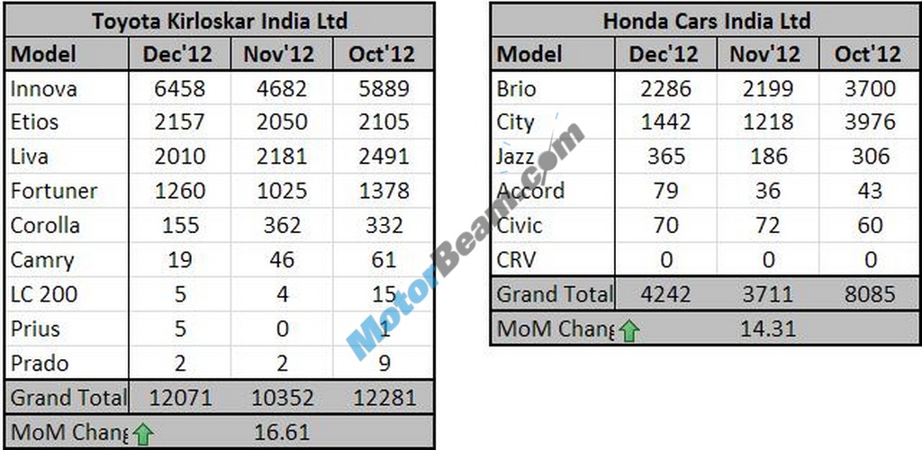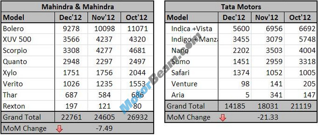 The Mahindra and Mahindra might be quite surprised as its two main SUV offerings, XUV 500 and Scorpio, lost sales badly. But we can also see that its baby SUV Quanto is about to reach sale of 3000 units a month. Overall, Mahindra and Mahindra lost 7.49% of sales compared to November. The month of December is the worst ever month of the year for Tata Motors as it sold just 14,185 cars, thus making it a bad year-end for the company and also a not a pleasing thing to mark the retirement of Mr. Ratan Tata. Tata Nano and Aria have recorded worst sales figures of 2202 and 5 units respectively. Also, Sumo and Venture gave their worst performance of 2012. Thus, Tata Motors closed the year with 21.33% drop in total sales.