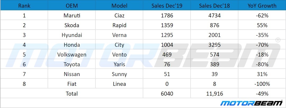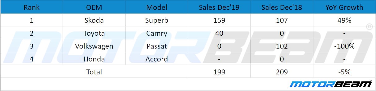 As we stray further down to the luxury sedan category, Skoda flourished in this segment as well. The Skoda sold 159 units of the Superb. Toyota Camry sold 40 units in December 2019, whereas it sold 0 units in December 2018. Volkswagen Passat and Honda Accord sold no units. Volkswagen Passat observed a 100% degrowth. Altogether, the segment recorded a negative 5% growth.