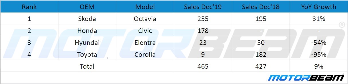 Coming to the premium sedan segment, the topper here is the Skoda Octavia. The Octavia sold 255 units, a 31% rise from December 2018 sales. Second is the Honda Civic which sold 178 units. Hyundai Elantra and Toyota Corolla sold 23 and 9 units respectively with the Corolla observing a negative 95% YoY growth. Cumulatively, the segment experienced a positive 9% growth.