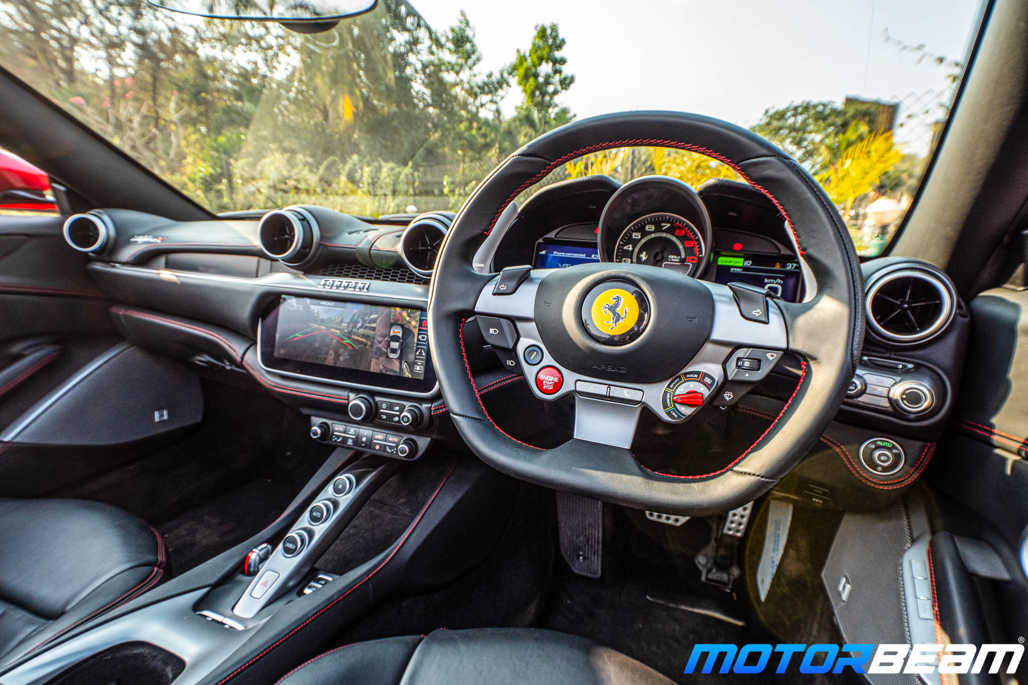 Driving Dynamics – Driving the Portofino M on Indian roads is surprisingly easy as the ride quality is quite compliant (by sports car standards). Switch to comfort mode and you almost forget you are driving a Ferrari, such is the level of suspension compliance. It’s stiff but not unbearably so and then there is a bumpy road setting too. Ground clearance is good enough to tackle most speed-breakers but you will have to angle the car over the bigger ones. Handling is good, not great, it’s not razor-sharp, it’s not supposed to be because like I said, it’s a master of some trades. The steering is light enough at low speeds, weighs up brilliantly at higher speeds and high-speed stability is excellent. Body roll is completely absent and grip levels are fab too. Just don’t expect it to be as good on the track as Ferrari’s mid-engined models. Brakes are superbly calibrated and are carbon-ceramics of course, Ferrari doesn’t do steel discs!!