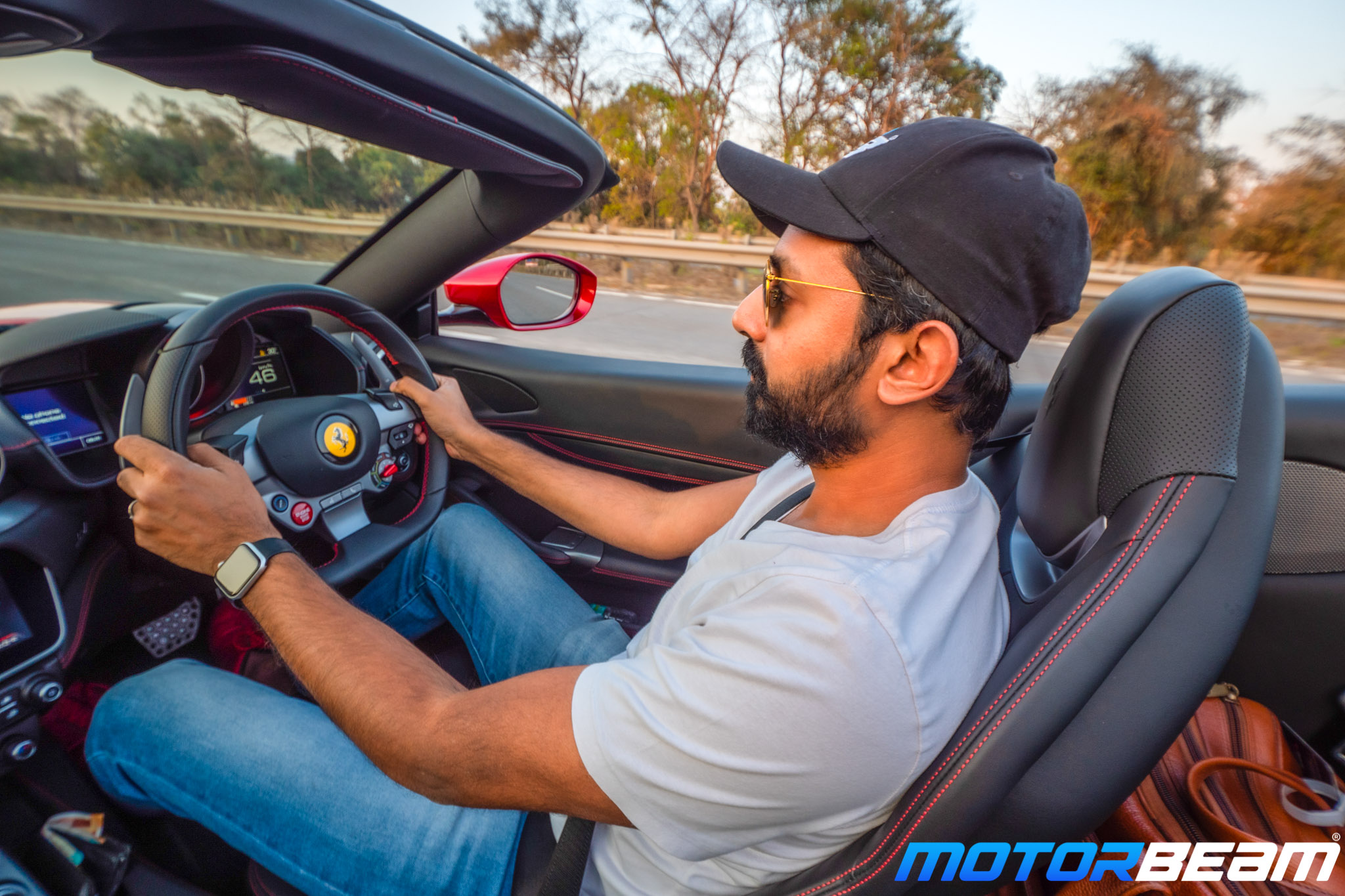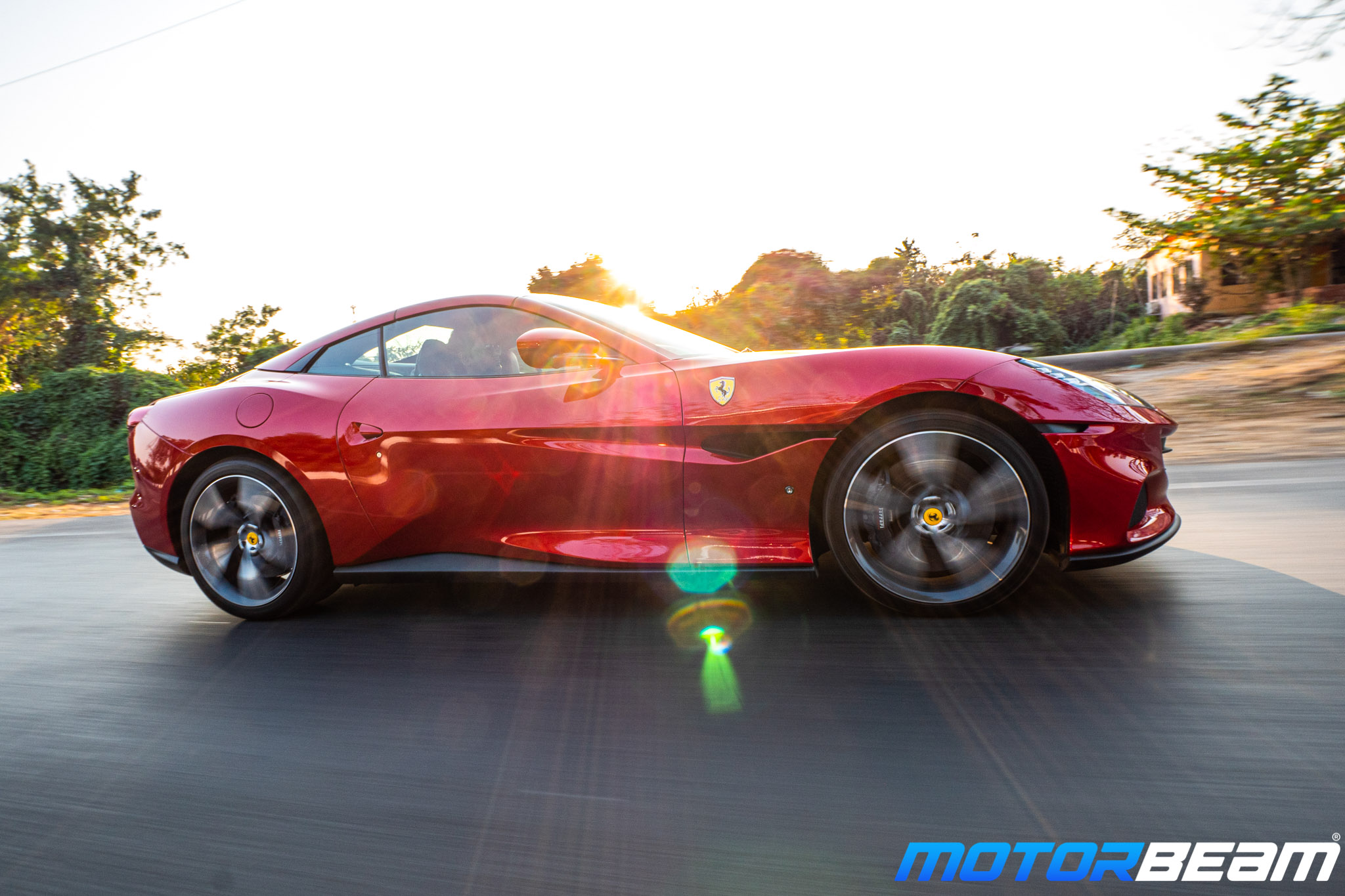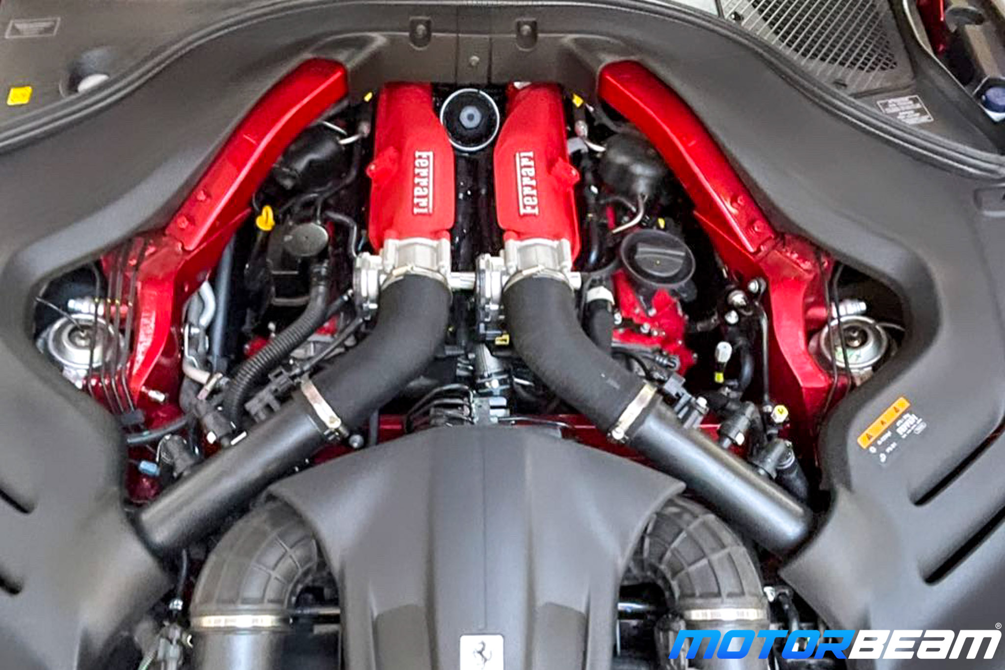 612 HP and 761 Nm is channelled to the rear wheels with great ferocity, enough to break traction in a blink (at least on the far from perfect Indian roads). 0-100 km/hr comes up in 3.45 seconds while 0-200 km/hr takes 9.8 seconds (it’s slower than the Roma as it weighs 100 kgs more as it’s a hard-top convertible). The motor revs really fast and hits the 7500 RPM redline with sweet aggression that makes you want to launch it again and again. The gearbox has been upgraded, it’s an 8-speed dual-clutch unit that’s super quick with shifts, before you blink, it’s already shifted cogs. You can manually take control too but you are just going to end up bumping off the rev limiter, time and again because the engine revs super fast and most of us can’t keep pace with gearshifts, at least not when compared to the automatic gearbox which is just in a crazy hurry. Fuel efficiency, do you really care? It’s 2-6 km/l if you do!
