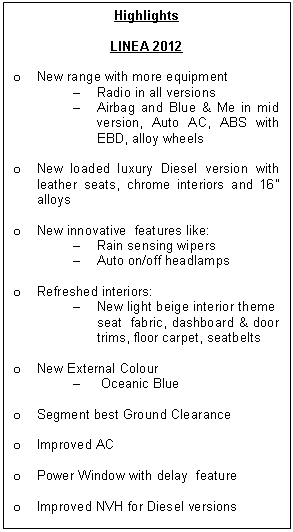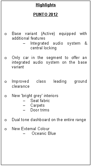 “At FIAT it is our constant endeavor to provide customers with newer and better cars with timely upgradation in comfort and technology. Since customer satisfaction is of utmost importance, we continuously look at ways to provide better value through our cars. With the launch of 2012 Linea and Punto this year our customer can enjoy an experience which is delightful and uniquely FIAT,” Mr. Rajeev Kapoor, President and CEO, FIAT India, said.