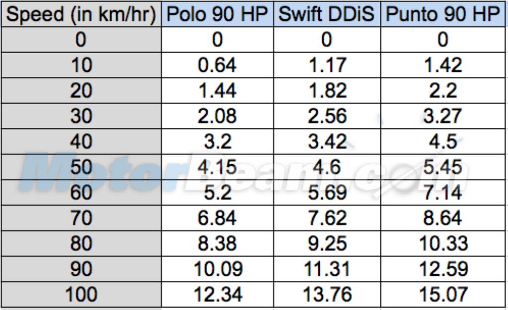 The above numbers don’t lie, the Volkswagen Polo easily outruns the other two right from the word go. The Swift is able to post a respectable 0-100 km/hr time, thanks to extremely good gearing, it has the best gearbox here, followed by the Polo while the Punto Evo has the worst gearbox. The Swift also has the best clutch, the Punto has a long travel clutch while the Polo’s is a bit heavy. So when we were doing the VBOX performance runs, we noticed that the Punto’s notchy gearbox (is good when shifts are done slowly but gets notchy when you get aggressive) robbed it of a good start, going quickly from first to second is a task and the first gear’s short gearing robs away time too. The Swift’s poor tyres made it difficult to launch the car as we had to reduce launch RPM to prevent wheel-spin which comes in plenty. The Polo was the easiest to get a good time on, it takes off quickly without any drama and you can quickly swap gears, timing upshifts accurately.