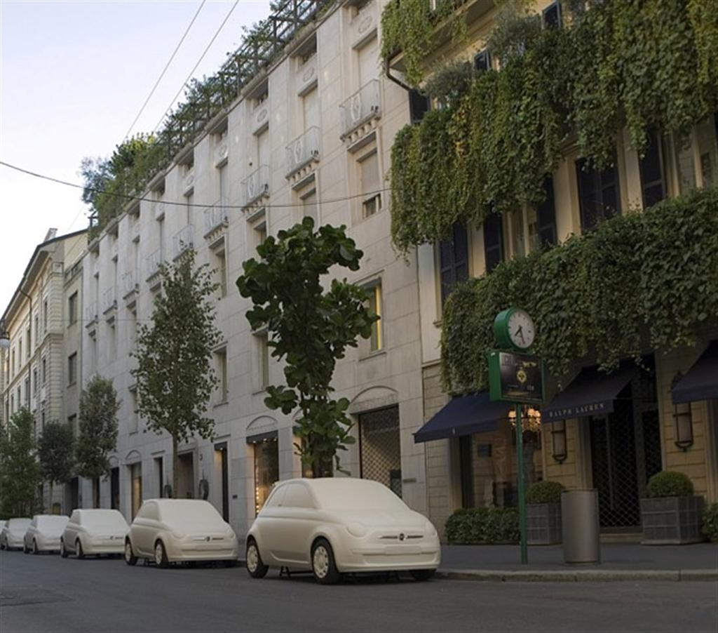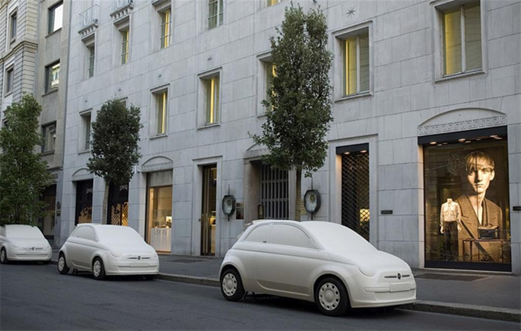 The cute Fiat 500C has been parked at the famous fashion street of Milan, Montenapoleone. But this is no ordinary Fiat 500, the cars are fiberglass replicas of the 500C, all the same dimensions as the original. The 20 fiberglass replicas are part of “Per fare un albero” (Create a tree) campaign jointly developed by the city of Milan, Fiat and designer Fabio Novembre. The objective is to bring together trees and cars.