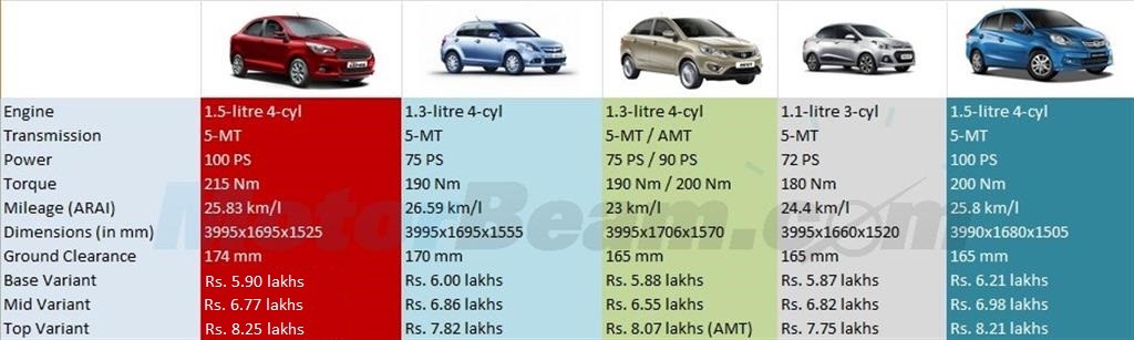 Figo Aspire vs DZire vs Zest vs Xcent vs Amaze – Diesel Comparison