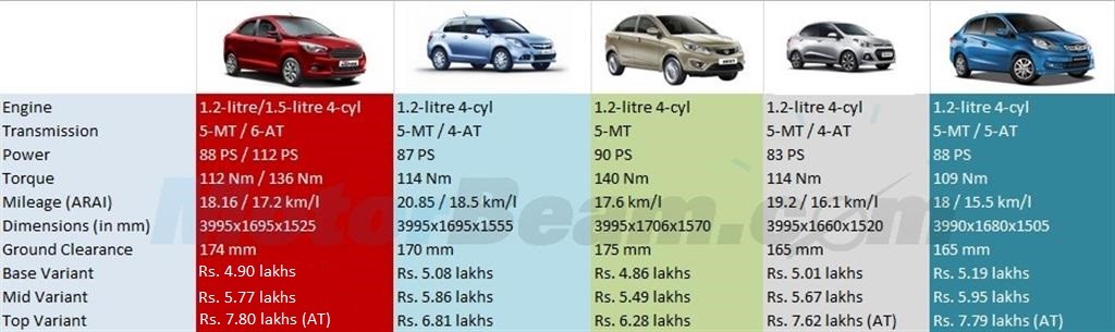 Figo Aspire vs DZire vs Zest vs Xcent vs Amaze – Petrol Comparison