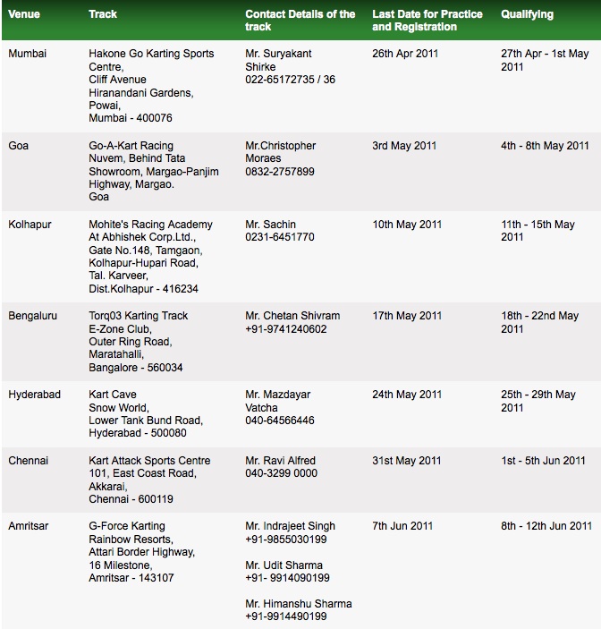 Silverstone Finale – From October 3 to October 8, 2011, ten finalists from the National Final will go on to do a week-long intensive stint at Silverstone, UK comprising sessions on driver tuition on Dmax Karts, a day at the Porsche Human Performance Centre to assess and develop fitness for motorsports, media training with Goodman Media, two full days at the Silverstone F1 circuit with sessions on safety, car control training, driver assessment, and race procedure briefing. The ten selected drivers will complete their Silverstone experience with a race in Formula Silverstone cars. At the end of the intensive hands-on week, an expert panel will pick three winners on the basis of a holistic assessment of their multiple capabilities and proficiency in requisite areas. The three winners will be announced in India around the time of the Grand Prix of India in October 2011.