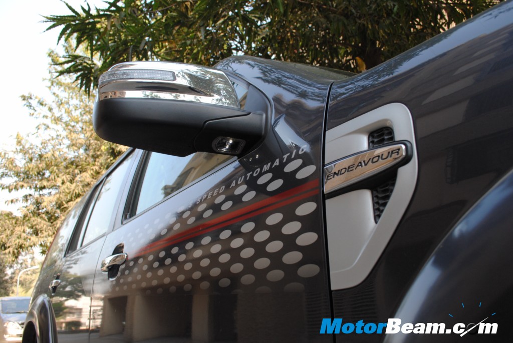 The Endeavour looks menacing and has its name inscribed on the chrome strip at the front of the bonnet. Glass area is large and this gives a spacious feel to this SUV. The Automatic version of the Ford Endeavour comes with body graphics on the front doors which read ‘5 Speed Automatic’. Side step and roof rails add to character and appeal. Puddle lamps are placed just below the ORVM’s which also house the side indicators.