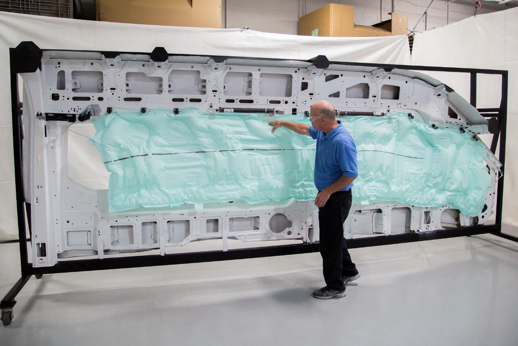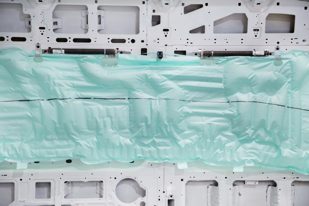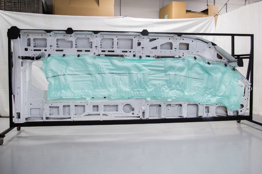 The side curtain airbag measures 15-feet long and is 3-feet tall, having an internal volume of 120-litres. To put things into perspective, the side curtain of the Ford Fusion sedan is approximately 6.8-feet long and 2-feet tall, with a volume of 42-litres. So in order to cover five rows of seats, the airbag is almost thrice the size of a regular side curtain airbag developed for the Transit. Ford states that despite the large volume of gas, the airbag still inflates instantly and has been engineered to deploy evenly and then remain inflated for a few seconds after impact.