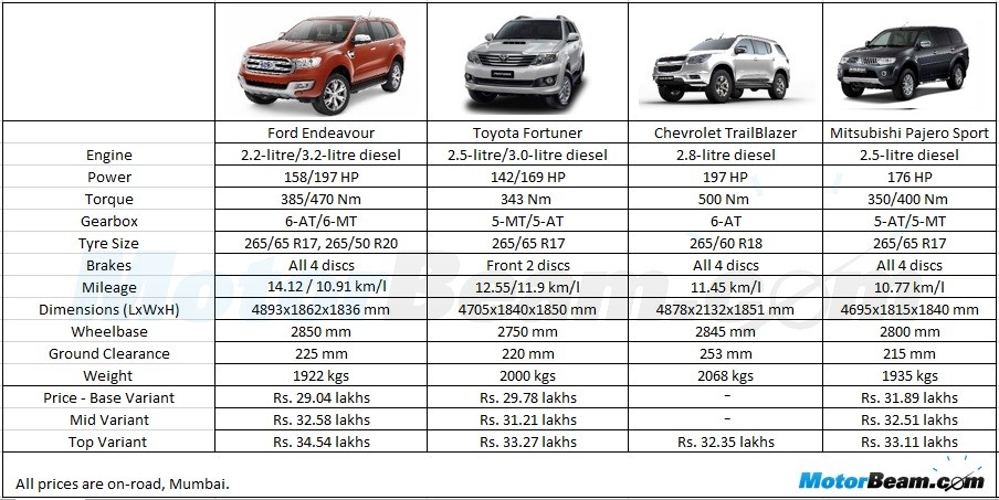 All cars are offered with an automatic transmission but it is the TrailBlazer which does not get a manual gearbox. The Fortuner gets only front disc brakes while all other SUVs get all four disc brakes. In terms of ground clearance, the Pajero Sport has the least at 215 mm while the TrailBlazer has the most ground clearance, standing at 253 mm. The Endeavour is available with a very useful Terrain Response System too. All four SUVs have more or less similar levels of fuel efficiency but the Endeavour 2.2 has a marginally better number than the other three.