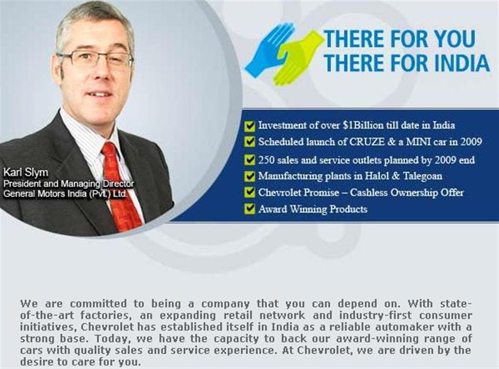 With the North American operations of car major General Motors (GM) filing for bankruptcy, its Indian subsidiary has been busy sending out messages that all is well. The company has posted some of its key representatives across 35 cities to handle fear or apprehension that the customers may have on the future of GM’s operations here in India. To address concerns related to spare parts, investments, new launches and service networks in the country, the company is launching a new marketing campaign called “there for you, there for India”. You can checkout more here.