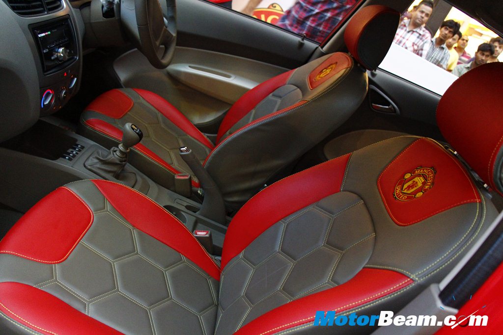 Step inside and the football love only continues. The Beat gets special seats done up in red leather seat covers complimenting the theme outside, while the Sail U-VA gets the Manchester United signature embroidered into the black leather seats. The dashboard and door trims also get red inserts to complete the Man Utd look inside the cabin. The special edition models also get leather wrapped steering wheel, illuminated LED scuff plates, 2-DIN audio system and Bluetooth connectivity as well as reverse parking sensors as part of the features list.