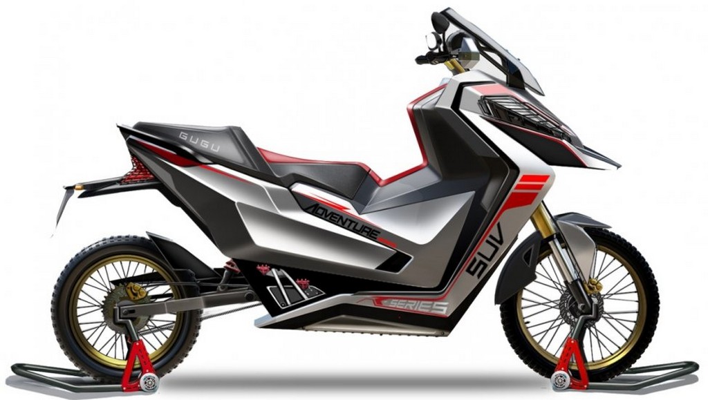 The Gugu R-SUV looks like a maxi-scooter with the silhouette of an adventure motorcycle.