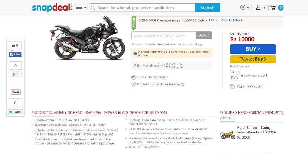 Retailing its entire range from the HF Dawn commuter to the flagship Karizma ZMR, Hero has ensured that customers with all sorts of budgets come and experience this virtual showroom of sorts. While the concept is definitely noble, it isn’t as simplified as it seems. For starters, retailing the two-wheelers on Snapdeal does not leave dealerships hanging. Under the virtual purchasing offer, customers will be paying only the booking (non-cancellable) amount online and will have to go to dealerships to complete the remaining documentation and registration process.
