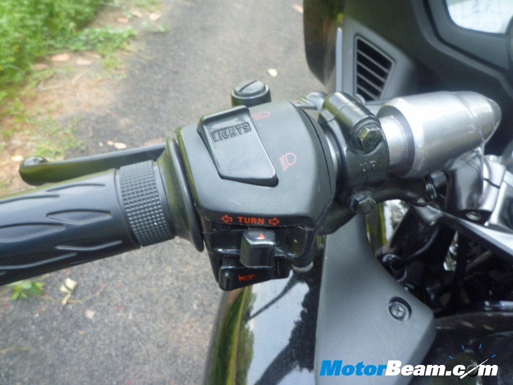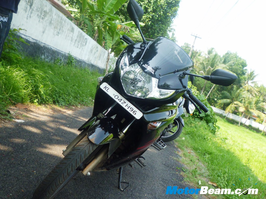 Styling – The first impression we had of the bike, through the photos were that it was un-inspiring, same quite goes to what it’s like in person, it’s just big, not very handsome to say the least, the headlight looks like a blown up version of the Suzuki GS150R’s. From the rear too, the bike seems disproportionate, a big wide tail light with indicators hovering over a comparatively puny bottom, not what we would like especially considering the price. The front fairing also seems to have received inspiration from another Suzuki bike, the Hayabusa, the ZMR logo has a striking resemblance to the logo on the same. The Panther black paint job on the bike looked good from a distance, but upon close inspection we could find flakes on the surface which was good until we noticed the ripples on the painted surfaces, not a glass like finish as expected. In terms of looks, it is definitely bigger, the Karizma ZMR looks good from certain angles especially from the front sides.