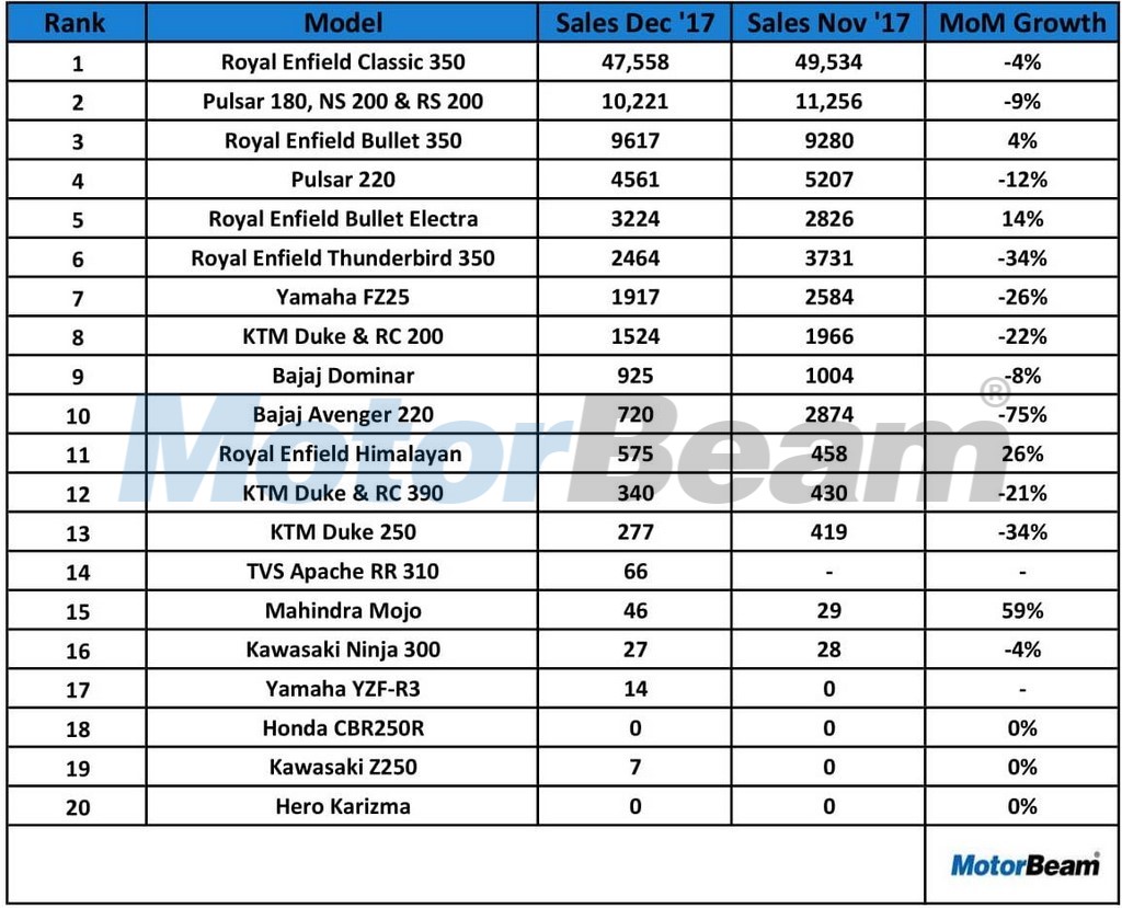 November and December have been quite dry months for the entire two-wheeler industry in India, especially the 200-500cc segment of bikes. Except for two Royal Enfield bikes, rest all the contenders on the list have posted a negative growth in terms of sales.