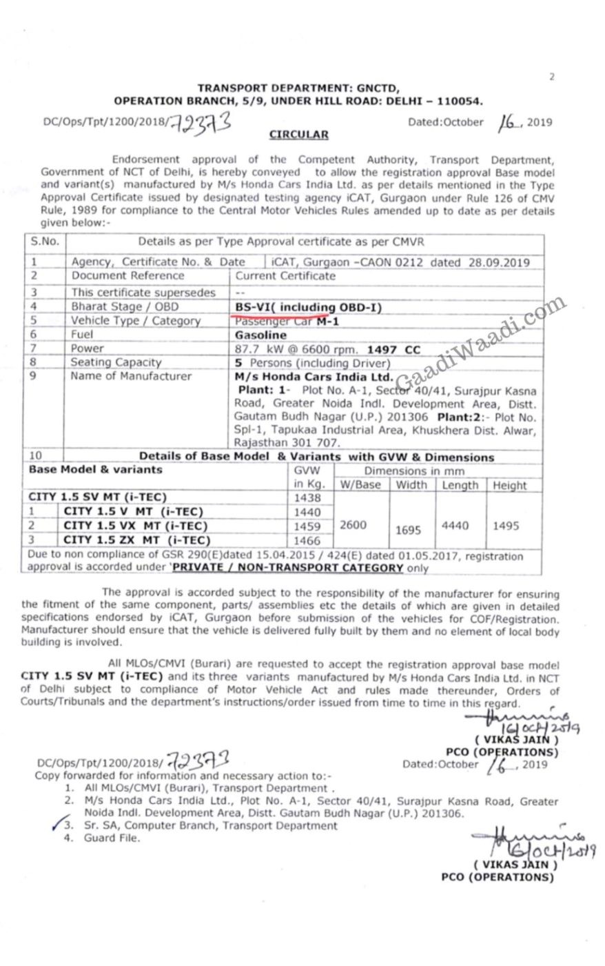 – New RTO circular reveals specifications of the BS6 compliant City petrol