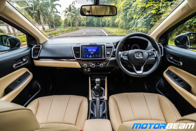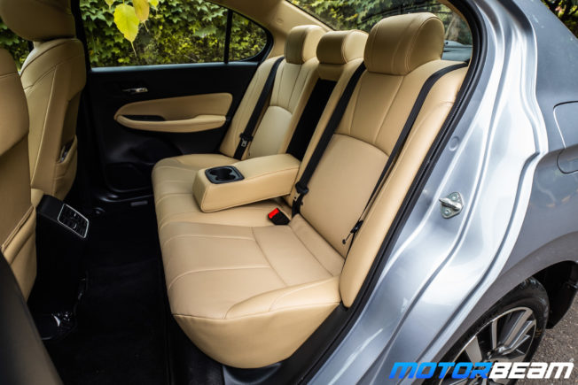 The City gets premium beige and black two-tone colour coordinated interiors. Though the dashboard design is conventional when compared to the 4th generation City, the car gets 20.3 cm advanced touch screen display audio with smartphone connectivity (Android Auto, Apple CarPlay, Weblink). The fifth-generation Honda City gets physical controls for air conditioning giving an impression that Honda is aiming for feedback. It gets soft-touch leather upholstery which can be found above the glove box on the co-driver’s side. Piano finish can be found around the gearbox with two cup holders below the air condition controls.
