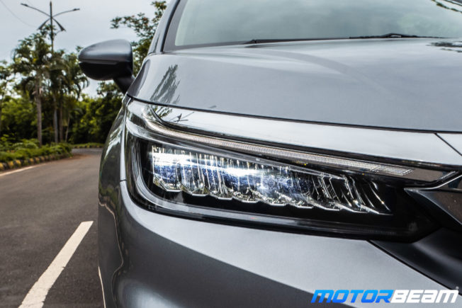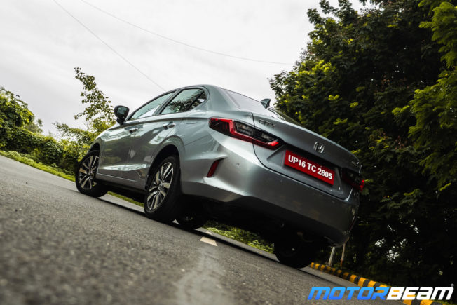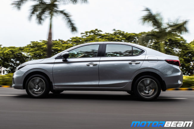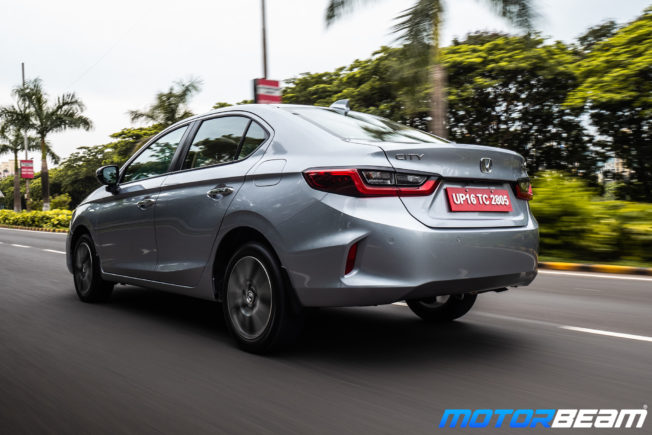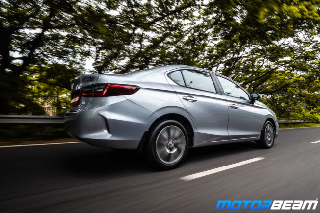 The car comes with diamond-cut and two-tone finished R-16 multi-spoke alloy wheels in all the variants. The City gets a massive chrome grille in the centre with a Honda logo. It acquires complete LED DRLs merging into the chrome grille. From the side, the 5th generation Honda City does get sharp looks but not as much as it was in the 4th generation. Nevertheless, the car is packed with cuts and creases on the side along with integrated LED turn indicators on door mirrors.