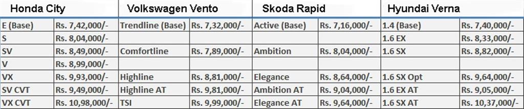 Here, we are doing a price comparison of the most popular C-segment sedans i.e. Honda City, Volkswagen Vento, Skoda Rapid and Hyundai Verna. Each one of them excels in their own way. While the City has been the market leader since a long time, the Verna overtook it recently owing to the fact that it came with more goodies and a diesel engine. However, Honda has just launched the 2014 City with a hope to regain its lost position. The Vento and Rapid are quite similar to each other and both are performing well and have recently got updates from their respective manufacturers.