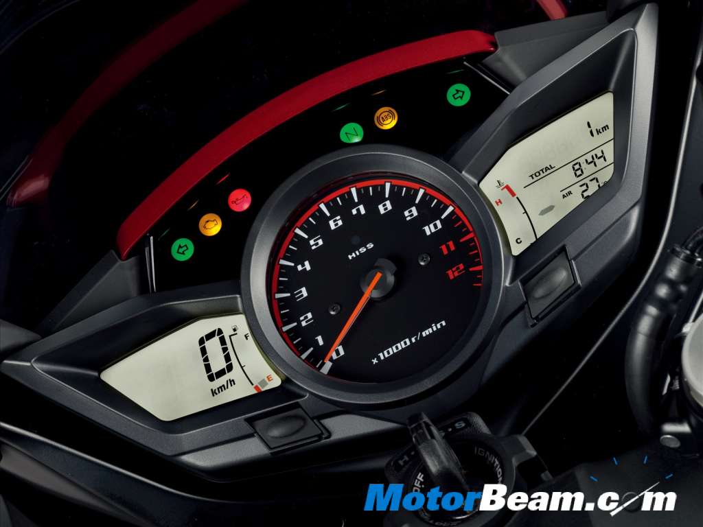 Completing the feel and sound of the bike are the triangular muffler and compact exhaust system which distinguish the raw compelling sound of V4 engine from any other motorcycle. Giving a stylish edge to the VFR1200F are the LCD readouts of fuel, coolant temperature level, Honda ignition security system (HISS) indicator, ambient temperature display and ABS indicator. In 2010, VFR1200F makes its stylish debut in Candy Prominence Red and Seal Silver Metallic colours.