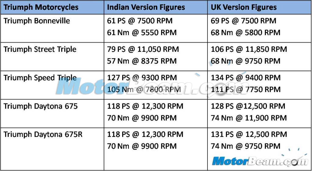 We all are aware of the issue that is going on with Triumph India. If you don’t, then here is a quick look. Triumph entered India late last year with most of its guns blazing. Sales charts looked promising which encouraged the British maker to introduce few more models. Sales were cruising for Triumph and the charts were green everywhere. Recently they updated their website where all the locally assembled bikes (CKD) had lower power ratings when compared to those of the ones sold in Europe (which is normal except on the Street Triple). It’s not new that Indian oriented vehicles are tuned for poor fuel; Triumph committed a grave mistake by not prompting its customers that Indian bikes were de-tuned. They neither updated their website nor did their brochures speak about Indian specs. Frankly speaking the customers were uninformed of the changes. The below table indicates the difference in performance characteristics of the locally assembled bikes.