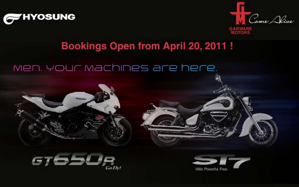 Its official! Garware Motors will start taking bookings for Hyosung superbikes from the 20th of April, 2011. The company will inaugurate its Pune showroom on the 14th of this month and has already received the bikes in Delhi. The Hyosung GT650R and ST7 are priced around Rs. 5.5 lakhs and come to India through the CKD route.