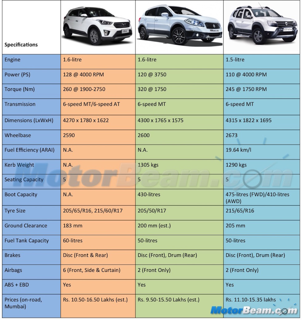 Engine – Both the S-Cross and Creta will be sporting a 1.6-litre diesel engine under the hood. Sharing its powertrain with the Verna, the Creta is expected to make 128 PS, the highest in the segment and 260 Nm of torque. The diesel unit on the S-Cross is all new and sourced from Fiat that will produce around 120 PS and a healthy 320 Nm of torque. The Duster uses the very capable 1.5-litre diesel motor that produces 110 PS and 245 Nm of torque. All models come paired to a 6-speed manual gearbox as standard, but the Creta will also get a 6-speed automatic from the Elantra. The Duster is the only offering at present to get AWD as standard and while the Creta and S-Cross come equipped with the same internationally, it needs to be seen if the manufacturers will introduce the same on the Indian model as well.