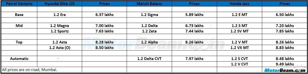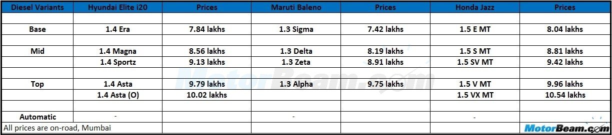 Base variants – The base trim of the Baleno is significantly cheaper than the i20 and the Jazz. The Jazz being the most expensive here offers the least value. Even when we take diesel variants into consideration, the Baleno is still the cheapest while the i20 is marginally pricier. The Jazz is again very costly. Talking about features, the Baleno and i20 get standard dual front airbags while the Jazz misses out on this important feature. The Baleno also offers ABS with EBD, something that is missing on both the i20 and Jazz. All the models get a manual AC and power windows though.