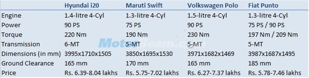 So, just like always, we at MotorBeam have come up with a quick comparo of the Hyundai Elite i20 with its closest rivals, i.e. Maruti Swift, Volkswagen Polo and Fiat Punto Evo.