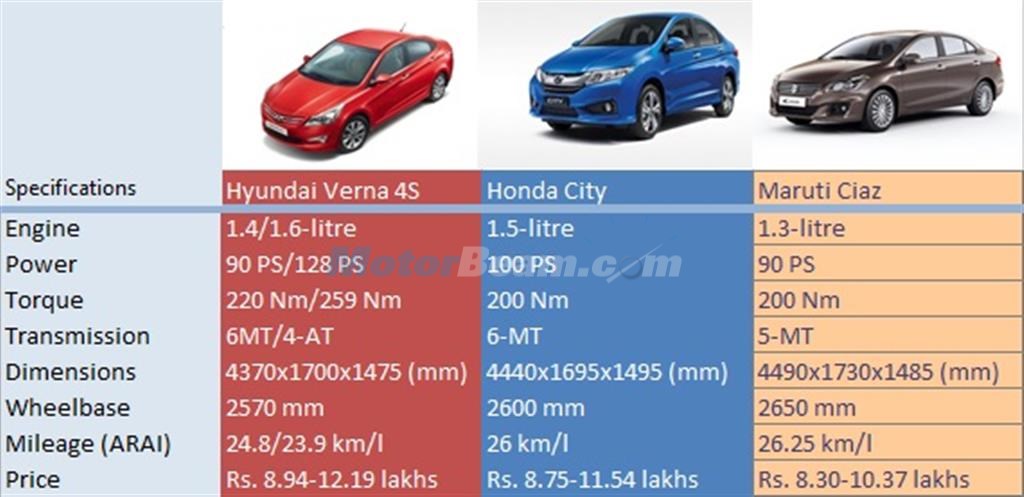Hyundai Verna 4S vs Honda City vs Maruti Ciaz – Diesel Spec Comparo
