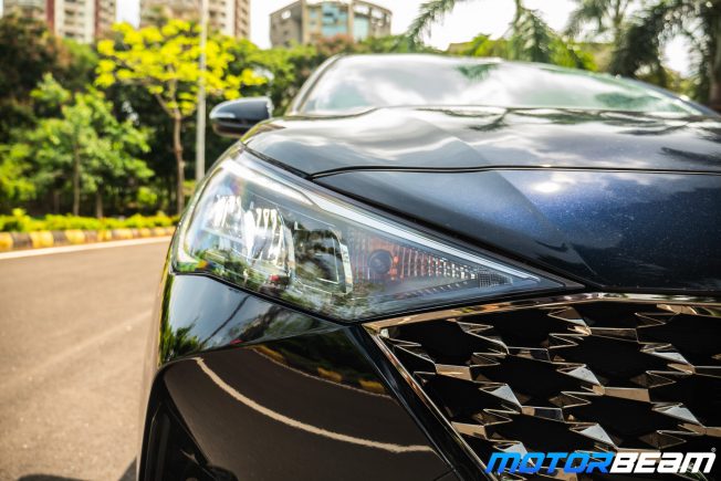 Upfront, the Verna gets a frameless dark chrome grille that looks premium and sporty. The headlights merge seamlessly with the front grille. The headlights get a LED setup, but the indicators and the fog lamps are still halogens. The bumper gets plenty of cuts and creases, and it also gets a mini spoiler. From the side, the coupe-like roofline has been carried over from the previous generation. The 16-inch diamond-cut alloy wheels look nice and sporty. From the rear, it gets a diffuser like treatment with chrome surroundings. The taillights get LEDs, but they are not completely LEDs.