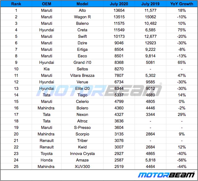 Top 25 Selling Cars In July 2020 – Hyundai Creta Posts Highest Gains