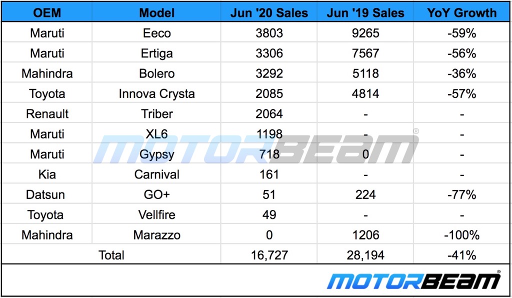 The Maruti Eeco hits the top spot with 3803 units and 59 percent fall in YoY numbers. The Maruti Ertiga and Mahindra Bolero fall one position down with 3306 and 3292 unit sales respectively.