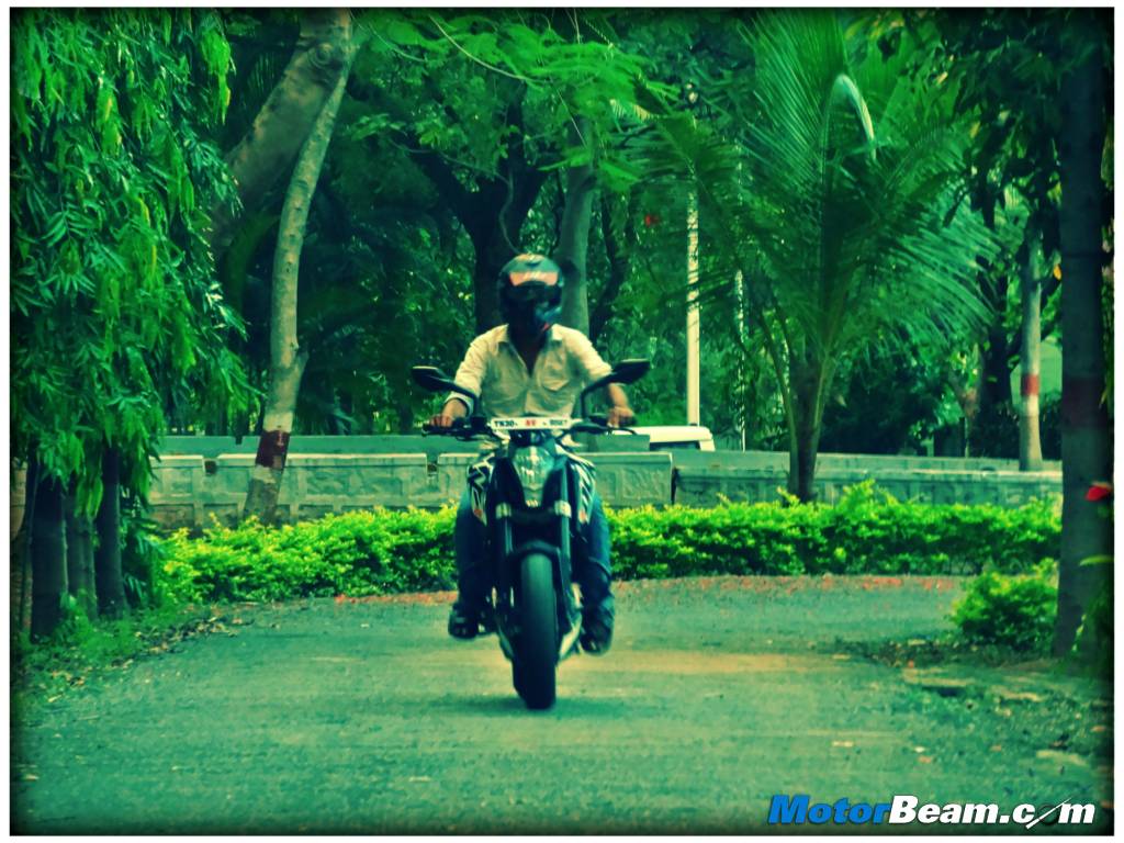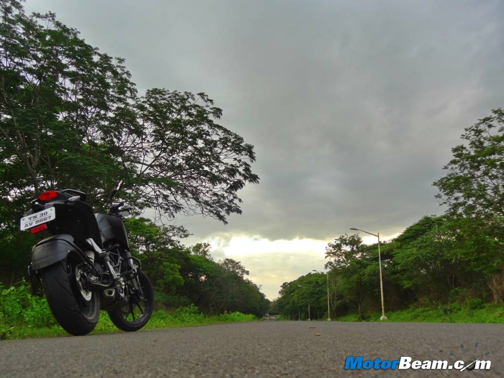 Handling the Duke 200 is quite awesome. It is very light and hard as steel. The handle is a little spiky and pains slightly. Changing handle rubbers with smoother ones makes comfortable and the paws can be relaxed. They are perfect for the streets. The turning radius is a little low which makes the bike a little hard to turn at narrow places. Cornering is absolutely fantastic. My friends had a feel that it was too light to corner so that it may fall onto the ground, but practically what I experienced was that it is highly stable through corners.