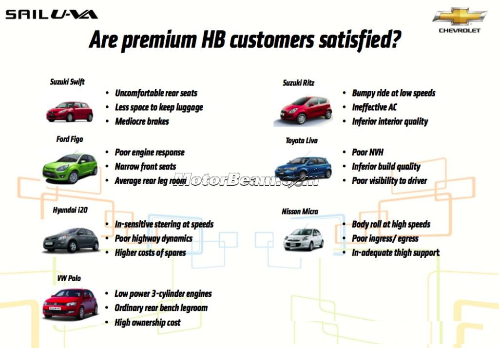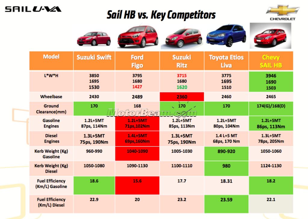 The diesel Chevrolet Beat (PS) starts at Rs. 5.49 lakhs, while the top end Beat diesel (LT option) costs Rs. 6.96 lakhs. The base variant (LS) of the diesel Sail U-VA should be priced at Rs. 6.0 lakhs, while the top-end Sail U-VA diesel (LT) should retail at around Rs. 7.3 lakhs. The Swift ZDi is priced at Rs. 8.12 lakhs, while the Ford Figo Titanium diesel is priced at Rs. 7.27 lakhs (all prices on-road, Mumbai). This way the Sail U-VA will undercut the Swift’s pricing by a considerable amount, while at the same time GM can prevent cannibalization with the Beat.