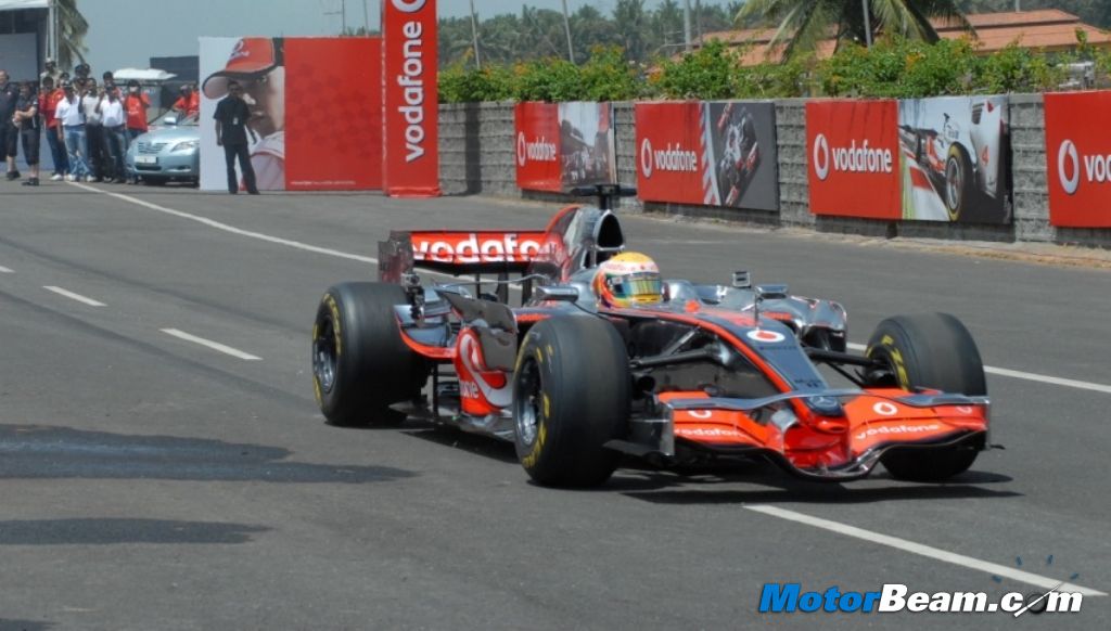 Vodafone had organized a formula one car run on India roads in front of more than 10,000 enthusiasts today morning. The event saw Lewis Hamilton drive his Vodafone McLaren Mercedes MP4-23 race car (2008 championship winning machine) at Nice Road, near Bengaluru while some lucky customers got the privilege of hot laps with Lewis and also visiting the pit garage to see the technology behind the team. The atmosphere at the NICE road was electrifying to say the least. The road looked like a Formula 1 track complete with grand stand the pit garage.