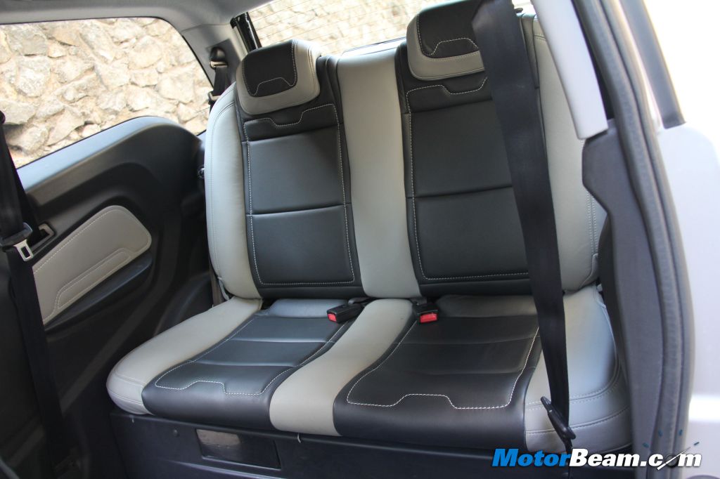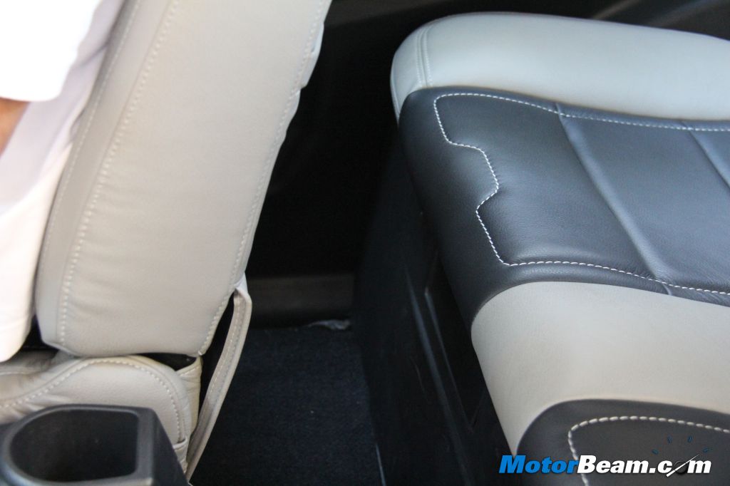Interiors – The interiors quality, fit and finish is average in the Mahindra e2o. The seats get a two-tone leather upholstery with white stitching. The front seats are perched above the batteries and this gives you a feeling of sitting on a chair, however, legroom, headroom and thigh support is pretty decent. Since the car is a two-door, entry to the rear seat is via the front. This means you have to drop the front seat to get behind. Hefty and tall people might find it hard to squeeze in, but once seated behind, it’s decently spacious for two adults. Third person is virtually impossible at the rear. However, if the driver is tall, rear legroom is limited and we reckon it fits best for small sized adults and kids.
