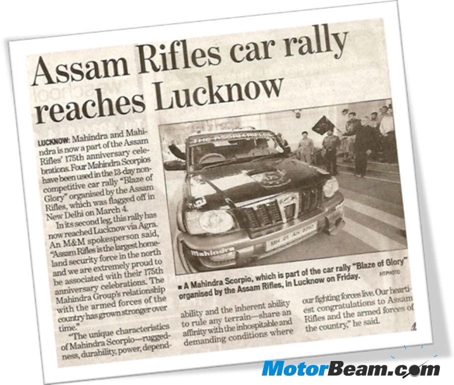Mahindra’s relationship with the Indian Armed forces dates back to the time it began assembling Jeeps in India. As a continuation to this association and their solidarity towards the fighting forces, Mahindra is now a part of the Assam Rifles’ 175th anniversary celebrations. 4 Mahindra Scorpios have been used in the 13-day non-competitive car rally “Blaze of Glory” organized by the Assam Rifles which was flagged off in New Delhi on March 4th by Shri Ajay Makan, Hon’ble Minister State Home Affairs. In its 2nd leg, this rally has now reached Lucknow via Agra and will be flagged-in at Imphal on March 16th enroute Varanasi-Buxar-Patna-Khagaria-Purnia-NJP-CoochBihar-Guwahati-Shillong and Dimapur.