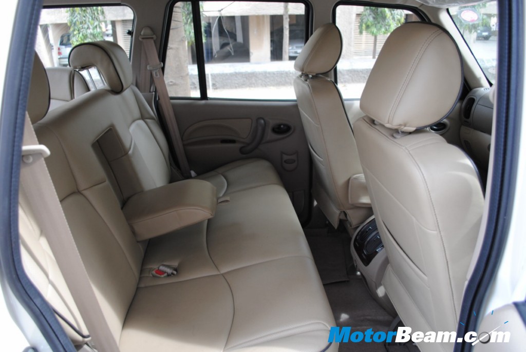 Interiors – Step inside the Mahindra Scorpio and the feeling is no less than a king sitting on his throne. The seating is high and the view is commanding. All around visibility is good owing to its large sized mirrors. Two tone Beige interiors look good and the wooden finish central console stands out and gives a rich feel to the Mahindra Scorpio. Leather seats are bonus on the looks. The steering is wrapped with leather and is comfortable to hold, meanwhile the audio system and the gear lever have been picked up straight from the Scorpios younger sibling, the Xylo.