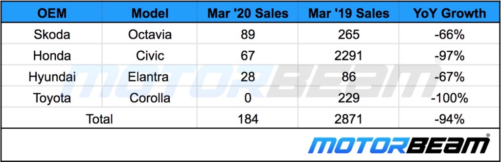 The D-segment space is limited to 2-digit sales in March 2020. The Skoda Octavia holds the top position with 89 units and 66 percent fall in numbers. The Honda Civic sales fall by 97 percent doing 67 units. Hyundai Elantra comes third with 28 units and 67 percent fall in sales. The Toyota Corolla has been completely discontinued.