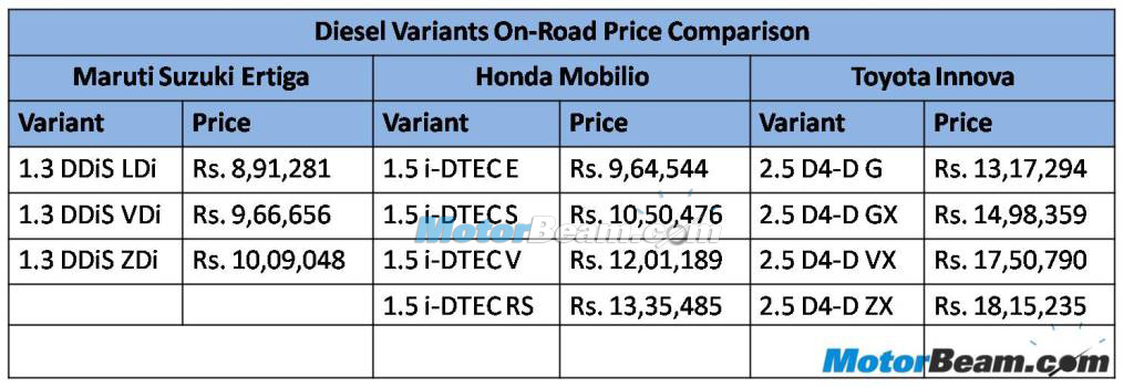 Diesel Models – The volume puller for all three manufacturers, Honda has managed to stick to a very competitive price with the Mobilio. Once again, the Ertiga is the least expensive here, but also sports the smallest engine under the hood. The Innova on the other hand seems astronomically priced in comparison with the base variant priced at a hefty premium of Rs. 4 lakhs than the base Mobilio and Ertiga versions. The Innova does manage to offer better space and comfort on the inside, but lacks equipment, while the Ertiga is decently loaded and the Mobilio feels on par but lacks Bluetooth connectivity, a shocking omission.