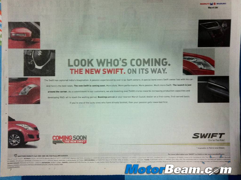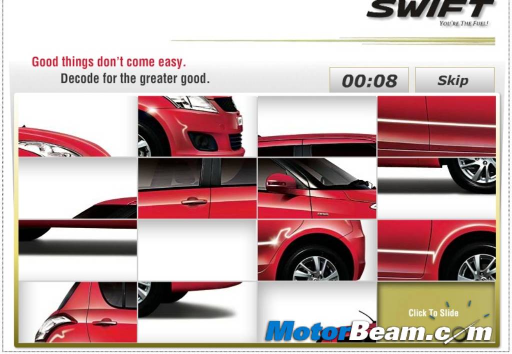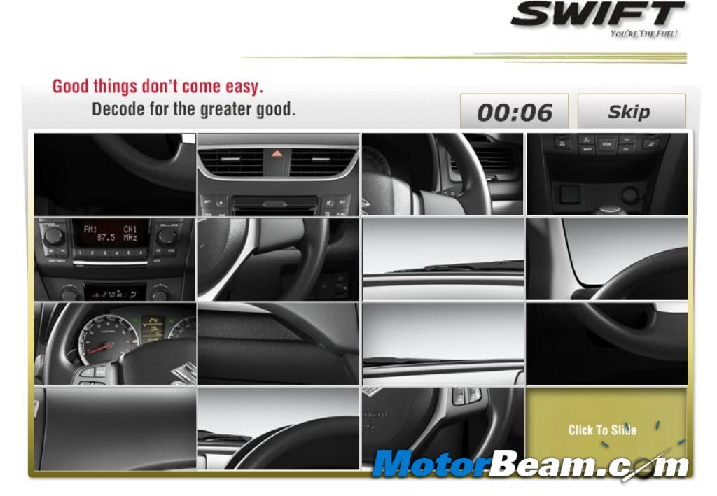 The new Maruti Suzuki Swift will officially be launched on the 17 of next month and the company has already started its teaser campaign. The country’s largest car maker has advertised in major newspapers (above) teasing us with the upcoming model. The website of the old Swift has been removed and has been updated with a teaser of the upcoming model. You can view the new Swift website here. There is not much on the website except a few puzzles, wherein you will get just 18 seconds to re-arrange 16 checker boxes to form the exterior or interior of the new Swift. Meanwhile, checkout all the information on the new Maruti Swift.