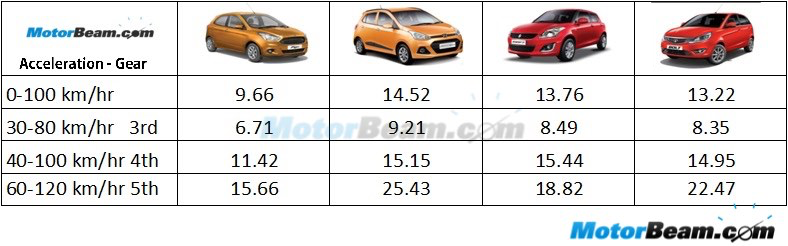 However, beating all three in drivability, mid-range performance and outright acceleration is the 1.5-litre diesel mill in the Ford Figo that outputs a segment best 100 PS and 215 Nm. As expected, the American car easily outruns all its rivals in the 0-100 km/hr run, taking under 10 seconds (9.66 seconds) to do the sprint to the ton. That’s not all, it also beats other diesel hatchbacks when it comes to in-gear acceleration, being considerably faster in all gears, as can be seen below.