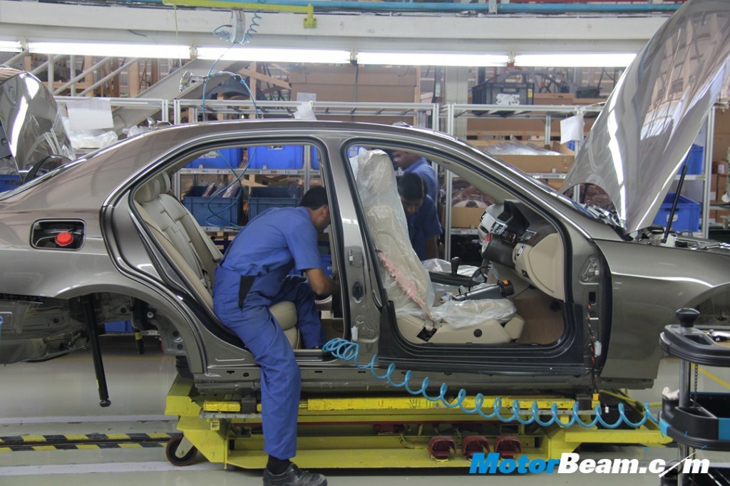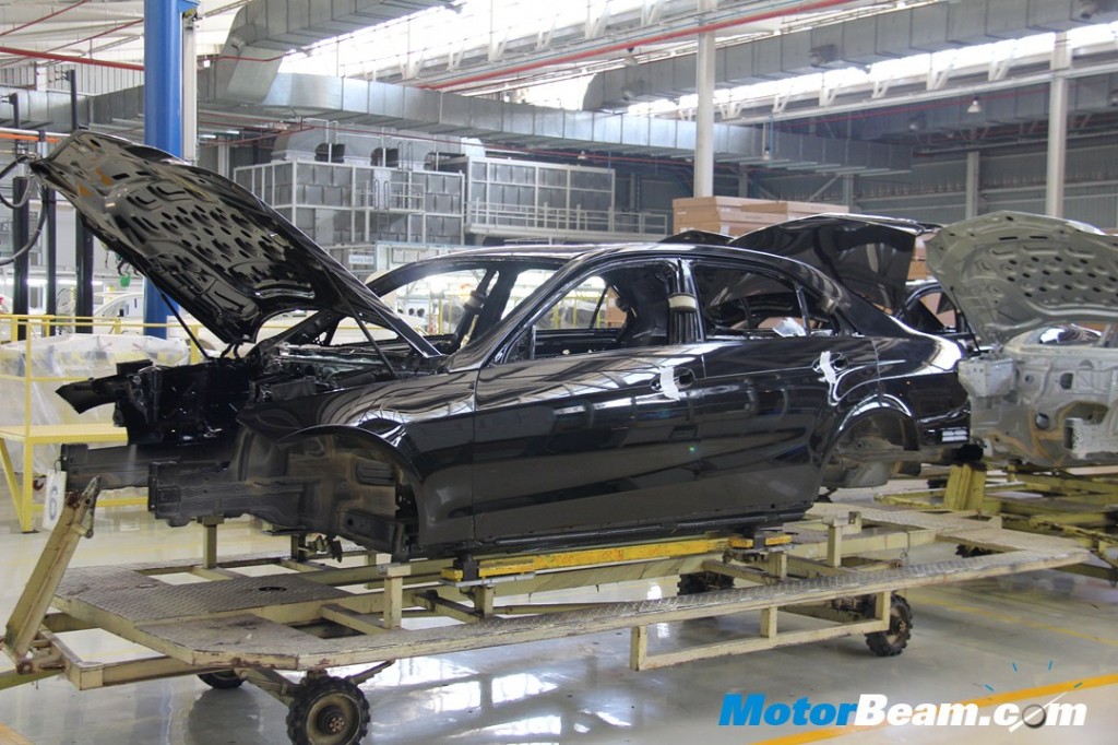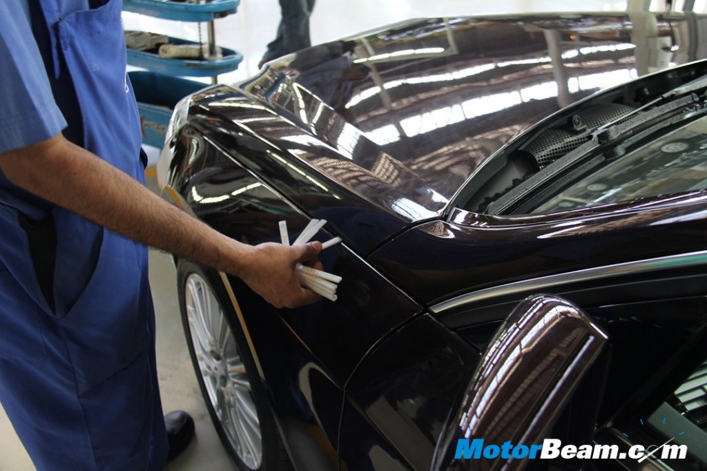 After the engine is mounted and tires are fitted, strict checks are made to check for the consistency in panel gaps. In the above picture, panel gaps are checked with the help of with a refernce key.