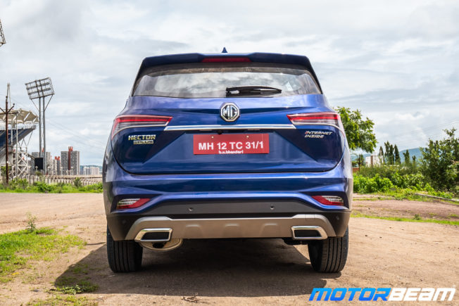 The Hector Plus gets some minor changes in the headlamps when compared to the one offered on the Hector. The fog lamps are also revamped and don’t get the tilted Fu Manchu moustache style chrome treatment as was offered in the Hector. Instead, it gets a bow like black treatment. The bumper on the Hector Plus has also received a minor change. The Hector Plus is 65mm longer than the Hector however the width and the height has been unchanged for the Hector Plus and is the same as the one on the Hector. The wheelbase is also the same and stands at 2750mm. From the rear, one will notice that the red stripe is not present in the Hector Plus as was the case with the Hector. It gets a new bumper and a revised skid plate. The bumper also gets two fake exhausts.