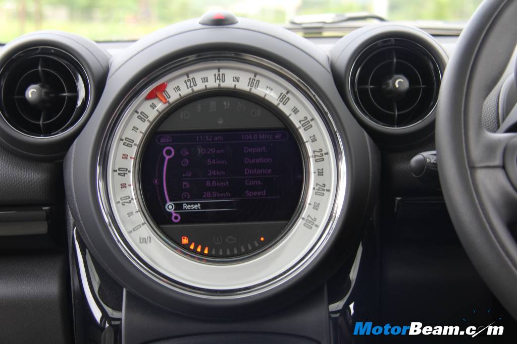 Interiors – The retro cabin of the MINI Countryman greets you with its modern touches. Quality levels inside-out are very good and the cabin is very well put together and feels rich in feel and appeal. The round AC vents go with the aircraft theme as the buttons inside seem to be inspired from aircrafts. You get a large speedometer in the centre which has a 6.5-inch screen inside it which displays an array of in car functions. This is similar to BMW’s own iDrive and works in a similar manner. The centre console is well laid out and everything is simple yet uniquely designed. The steering wheel has a tachometer attached to it, which moves when you adjust the rake. This analogue tachometer has a display below which shows speed and other car info like mileage, distance to empty, trip meter, etc. The positioning of the meter is a bit awkward as you can’t see the lower display in your line of sight.