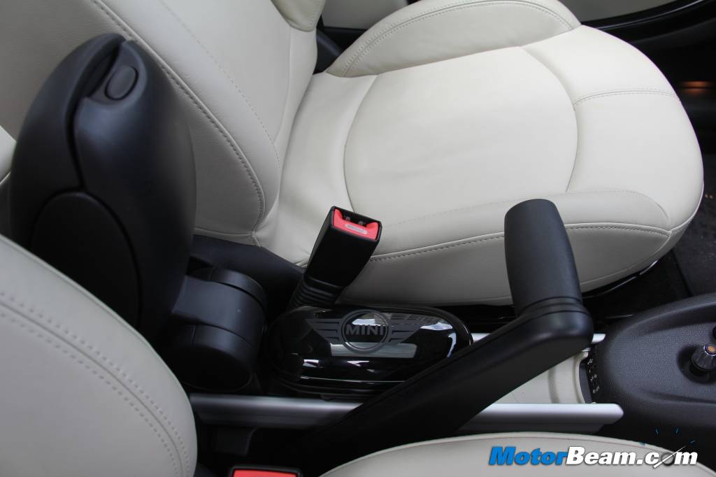 The all black dashboard gets piano black inserts which lift the ambience of the cabin even further. This finish is also carried on the doors which carry a very unique design for the storage area. There are quite a few places to keep things including cup holders, arm rest, glove box and a unique rail next to the handbrake, where you can use a sunglass holder. The Harmon-Kardon speakers offer good acoustics and everything inside the cabin seems like a work of art. The lighting is also very unique adding to the MINI experience. The toggle switches for the lights and sunroof over the inside rear view mirror are the same aircraft inspired. There are twin roofs in the High variant, the front one opens completely while both the front and rear roofs tilt upwards. The massive glass area and twin sunroofs boost the airyness inside the cabin.
