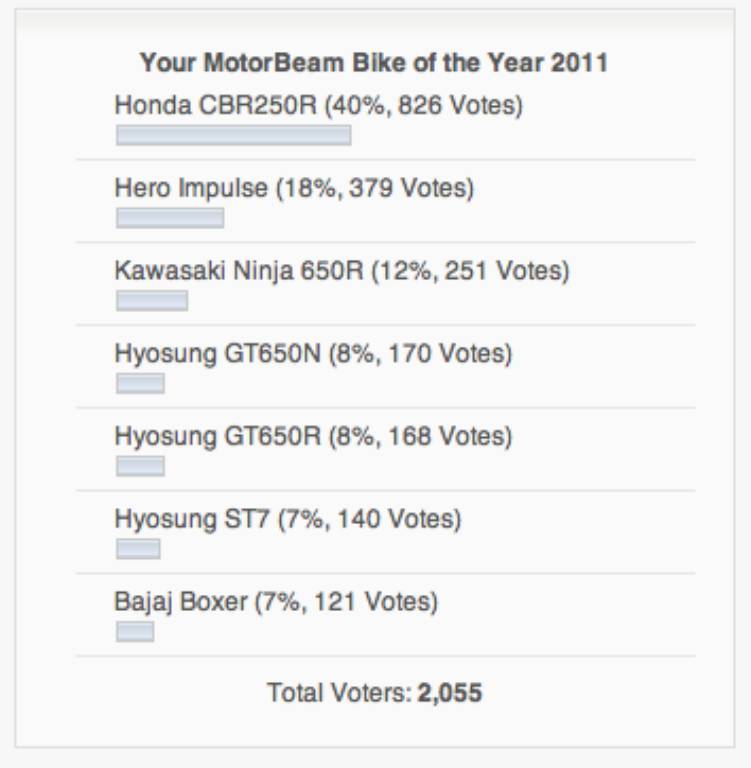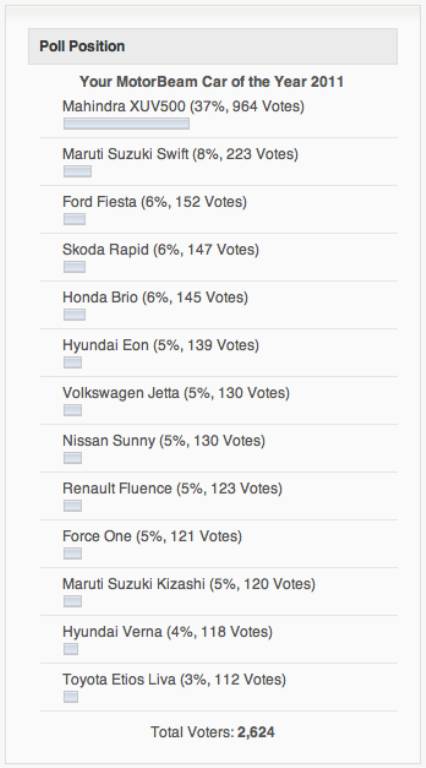 The results are out and MotorBeam readers have selected the 2011 car and bike of the year. The voting saw huge response but there was just no competition in both categories, with the winners taking away a major chunk of the votes with no competition in sight. Out of all votes registered, the Mahindra XUV5OO was the clear winner, taking away 37% of the votes, the new Maruti Swift was second with just 8% votes while the all new Ford Fiesta garnered 6% votes. When it comes to bikes, the Honda CBR250R amassed 40% of the votes, with the Hero Impulse coming in second place (18% votes) and the Kawasaki Ninja 650R coming in third place (12 % votes).